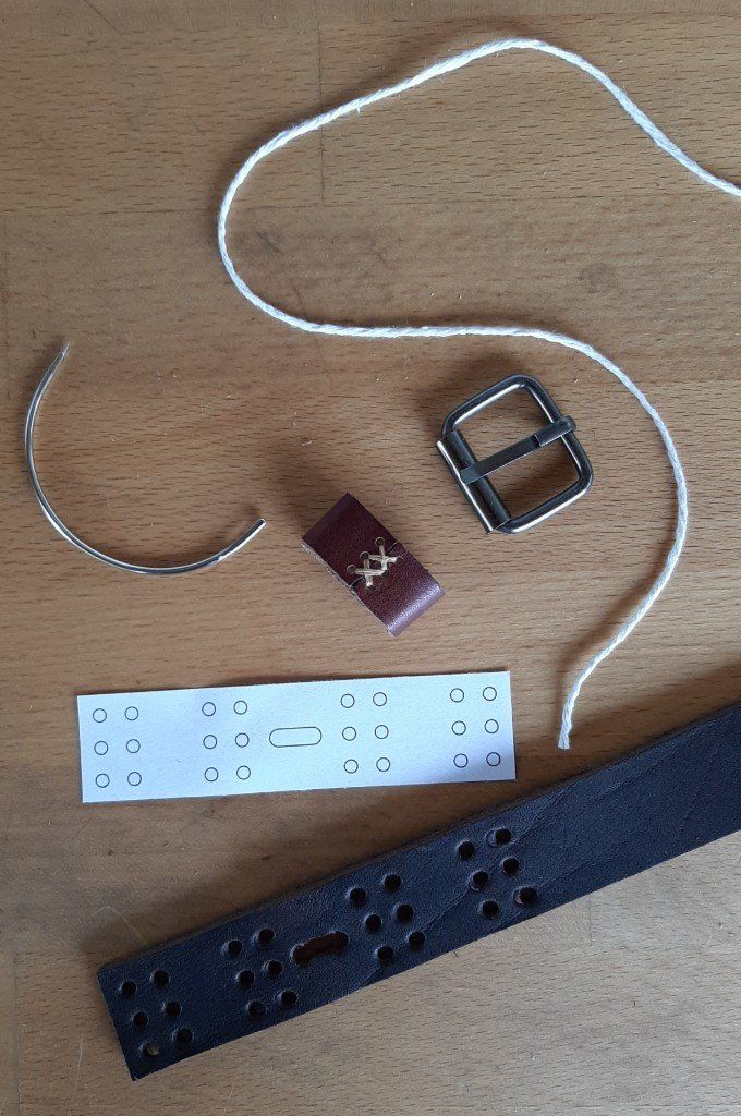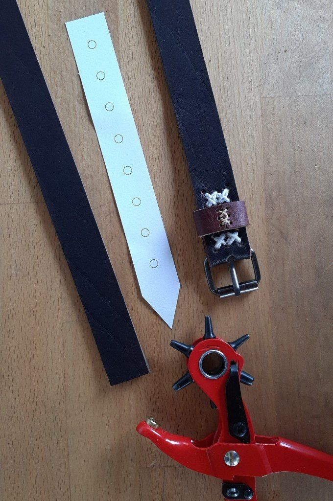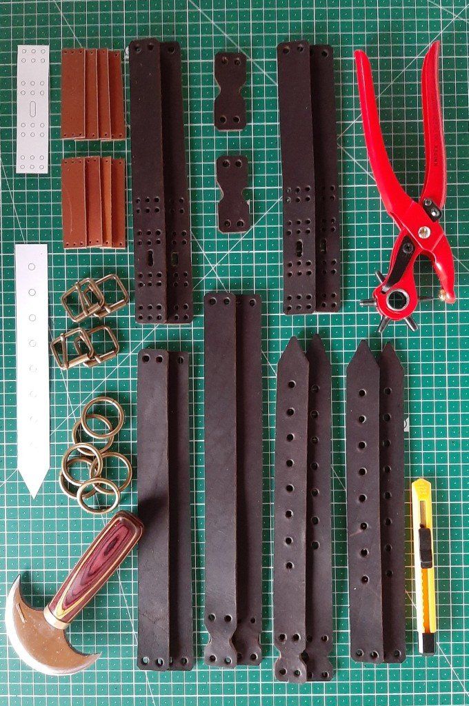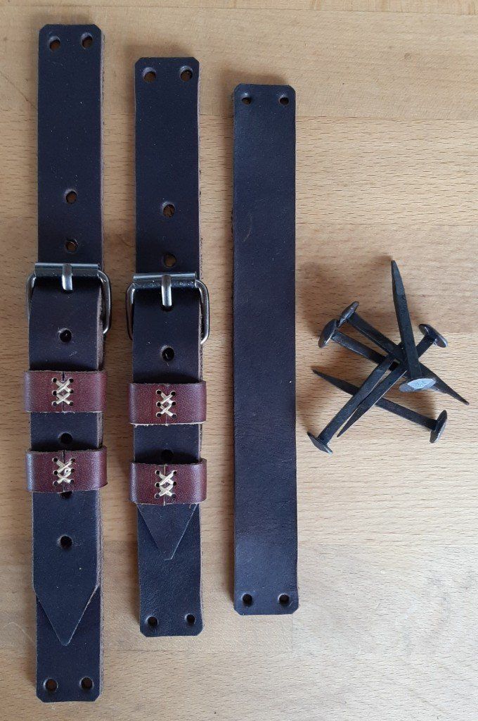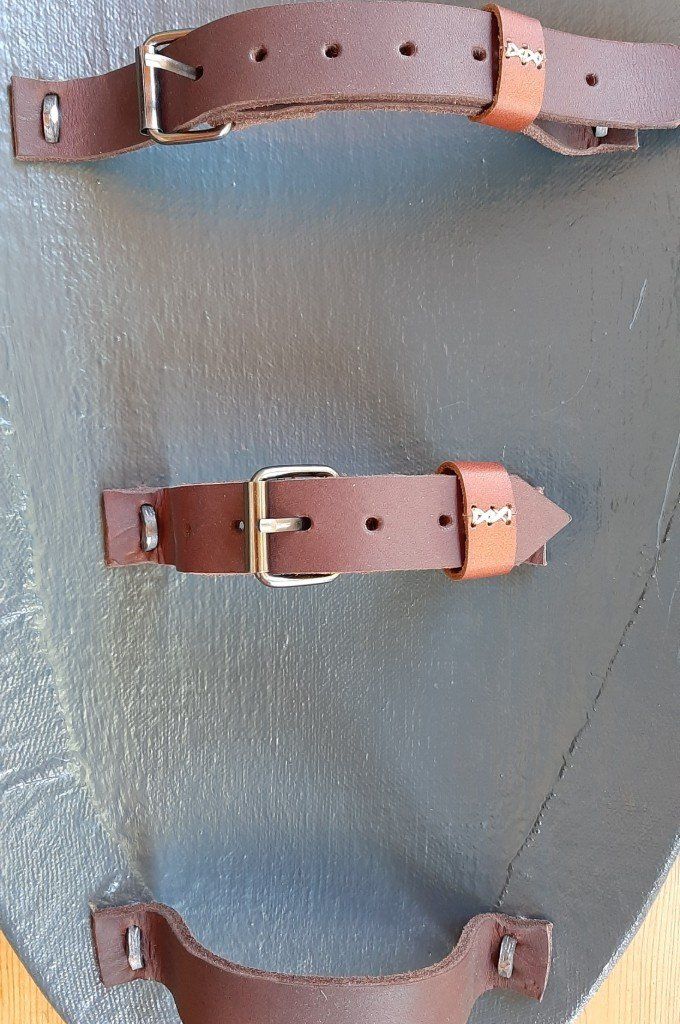 Aus einer Vielzahl an verschiedenen Techniken, welche im Mittelalter verwendet wurden, habe ich mich für die „extremste“ aber für mich einfach schönste Art der Befestigung entschieden. Es werden handgeschmiedete Nägel durch den fertigen Schild (vorbohren) geschlagen, auf der Rückseite werden die Riemen dann mit dem Nagel durch 2 Löcher fixiert. Dabei wird der ca. 5 mm starke Nagel an mit einer Rundfeile verjüngten Stellen 2x gebogen und die Spitze auf der Rückseite durch den Riemen wieder in den Schild geschlagen, das hält ein Leben lang. Auch hier arbeite ich wieder mit Papierschablonen, erstens, um die Löcher passend zu bohren, aber auch Schablonen, um die Riemen schnell und einfach produzieren zu können. Wichtig beim Einschlagen ist ein guter, harter Untergrund und Vorsicht, damit man den bereits fertig gestalteten Schild nicht verletzt. Die auf der Außenseite nun sichtbaren schwarzen, handgeschmiedeten Nagelköpfe verleihen dem Schild zudem eine starke und massive Ausstrahlung und unterstreichen die handwerkliche Qualität und die historische Optik. Die Polsterung mache ich aus bestem, ca. 4 mm dickem, weichen Leder, diese Schneide ich passend zwischen die Riemen und alles wird mit reiner Schaf-Schurwolle gut gefüllt und mit geschnittenen Nägeln gut aufgenagelt. Hier spare ich nicht, denn die Polsterung muss auch mal ohne Gambeson einen guten Schutz für Handgelenke und Ellbogen liefern.