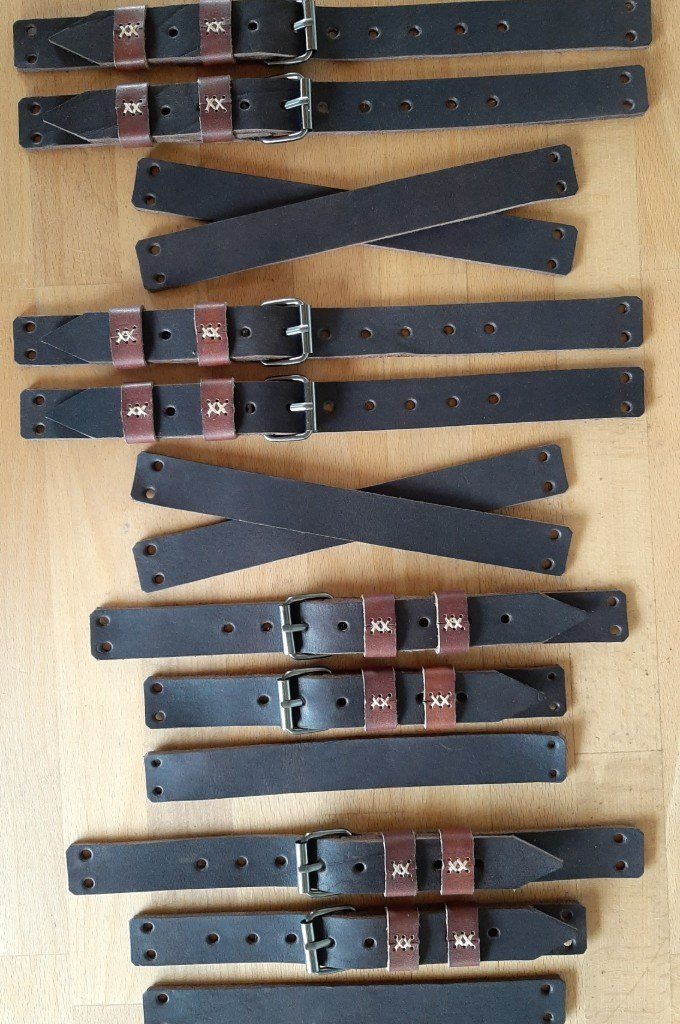 Dafür runde ich die Ecken der Schilde mit 3 cm Radien ab, will jemand eine Umrandung, bleiben die Ecken jedoch spitz. Die Umrandung mache ich nicht aus Rohhaut, sondern aus 4 mm starkem Fettleder. Exakt auf Gehrung zugeschnittene, 7 cm breite Lederstreifen, vernähe ich dazu vor der Montage an den Ecken zu einem Teil, welcher dann auf den Schild aufspannt und wiederum mit geschnittenen Nägeln in ca. 5 cm Abständen innen und außen gut vernagelt wird.