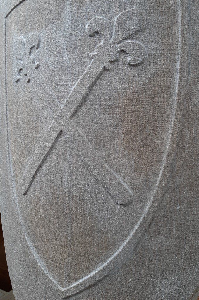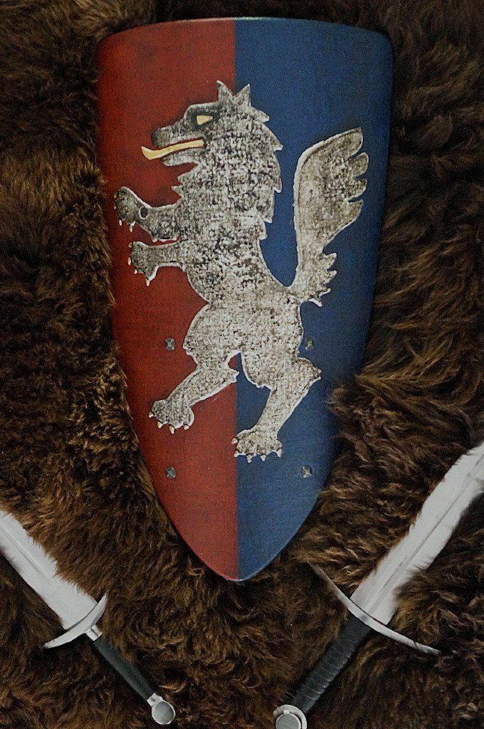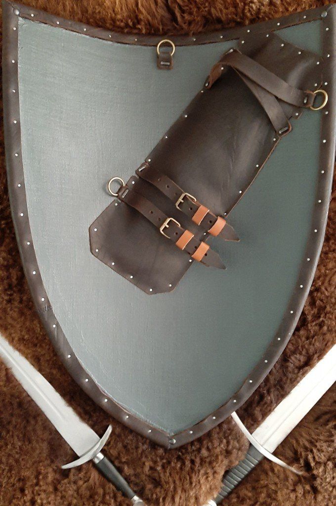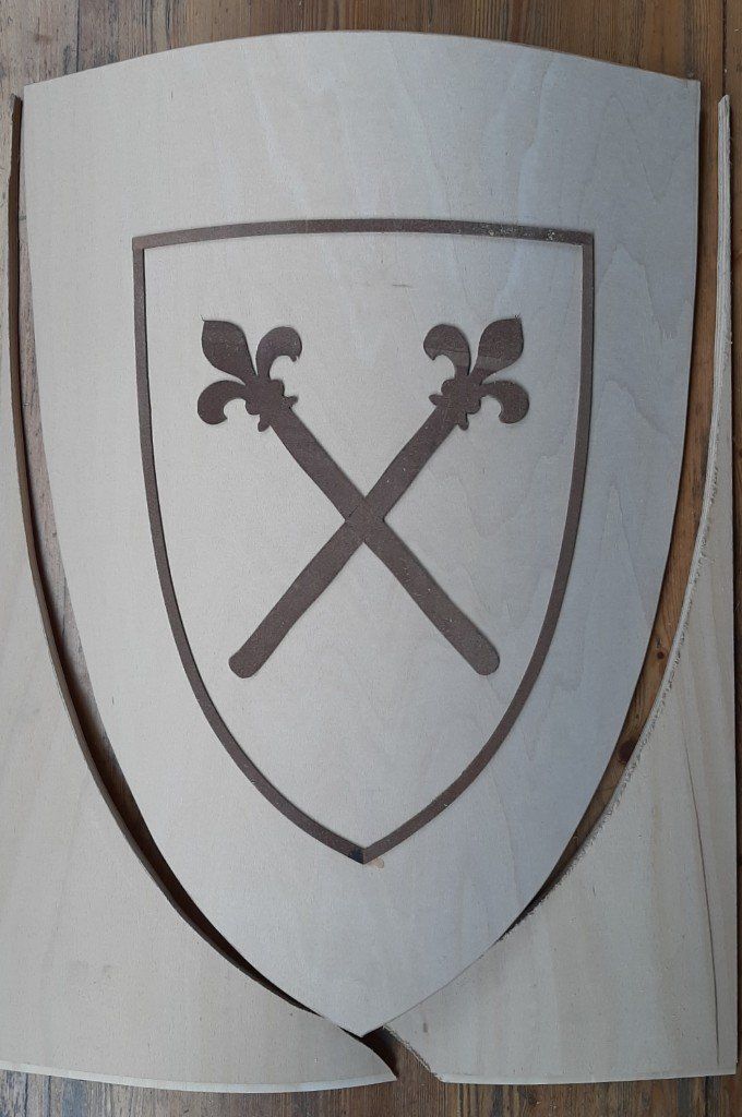 Für den Bau eines Schildes, welches bei Schaukämpfen bzw. Vollkontakt zum Einsatz kommt, war es mir vor allem wichtig, Schilde zu bauen, welche auch schwere Hiebe mit Schaukampfwaffen so unbeschadet als möglich überstehen und zudem auch die Machbarkeit und die Nachhaltigkeit, wobei man sich natürlich von einer identischen Bauweise, Verwendung identischer Materialien usw. teils verabschieden muss. Holz, ich verwende nur noch Buchenholz, Leder, echtes Naturleinen und handgeschmiedete bzw. geschnittene Nägel stellen hier nicht das Problem dar. Bei Leim und Farbe verwende ich jedoch herkömmlichen Kaltleim und wasserverdünnbare Acryllacke, welche eine weit kürzere Trockenphase haben und äußerst umweltfreundlich und strapazierfähig sind. Auch der Kreidegrund ist bei mir eigentlich komplett verschwunden. Historisch belegt sind auch Schilde ohne Kreidegrund zu finden. Der sichtbare Leinengrund, mehrmals mit Leimmilch bestrichen, bevor dieser bemalt wird, wirkt einfach sehr schön, wie ein Gemälde und ist ohne Kreidegrund gegen Schwert- oder Axthiebe weit unempfindlicher, es kommt zu keinen Abplatzungen. Wer die Leinenstruktur nicht mag: Geleimte Wandfarbe, welche aus reiner naturfarbenen Kreide produziert wird, eignet sich sehr gut dafür, diese rühre ich mit Leimmilch zu einem dicken Brei an und lasse diesen luftdicht rasten, das können auch Tage / Wochen sein, so lösen sich eventuell darin enthaltenen Knöllchen auf und trage diese Masse dann mit einer Spachtel, gedacht für Stucco Veneziano, mit Druck auf die mehrmals mit Leimmilch vorbehandelte und dadurch harte Leinenschicht (niemals wasserfesten Leim verwenden) auf. Der Vorgang kann mehrmals wiederholt werden und die Oberfläche ist komplett getrocknet auch gut schleifbar. Auf Reliefs mit Kreide Engobage, aufgebracht am besten mit einem einfachen Spritzsack, verzichte ich ebenfalls, ich schneide die auf das Schild aufzutragenden Elemente aus Leder zu und im Gegensatz zu historisch belegten Schilden, trage ich das Leder direkt auf das Holz auf und dann überziehe ich alles mit dem Natureinen, das Herausarbeiten des Reliefs ist zwar weit mehr Arbeit, aber so läuft die Leinenstruktur durch und kleine Lederteile sind unter der Leinenschicht besser gegen Hiebe geschützt.