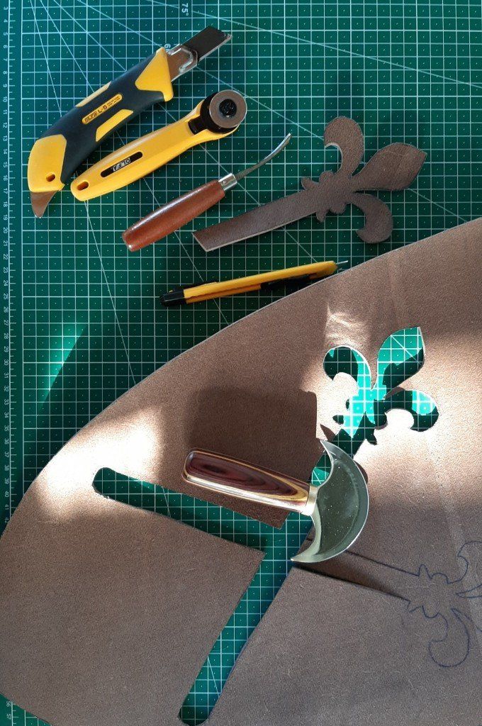 Für den Zuschnitt des nicht gerade günstigen Leinen verwende ich ebenfalls Papierschablonen, um Verschnitt zu sparen. Der Zuschnitt der Leder-Reliefs ist teils sehr aufwendig, Wappentiere, Buchstaben oder ähnliches haben oft sehr viele, kleine Detailformen. Hier kommt das Computerzeitalter zum Einsatz, was die meisten schlussendlich aber doch freuen wird, denn ich erstelle von den Wappen Vektorgrafiken, welche danach immer zur Verfügung stehen und auch Stickereien oder Ähnliches daraus in x-beliebiger Größe erstellt werden können. Die Grafik wird dann M 1 : 1 ausgedruckt und per Durchschreibpapier auf das Leder übertragen, ausgeschnitten und exakt am Schildrohling vollflächig aufgeklebt. Je nach Wappentier o. ä. besteht dieses meist aus mehreren Lederteilen, um Verschnitt, also wiederum Material und Kosten zu sparen. Anschließend bestreiche ich die Innenseite des Schild-Rohlings komplett mit herkömmlichem Kaltleim und trage die erste Leinenschicht auf. Sobald alles gut getrocknet ist, schneide ich überstehenden Leinen bündig zu den Kanten weg und bestreiche alles mit verdünnten Leim, die Konsistenz vom Leim ist etwa wie Sahne und lasse den Anstrich wieder trocknen. Nun folgt die Außenseite, wiederum mit unverdünntem Kaltleim vollflächig bestrichen ist es hier wichtig, den Leinen ohne Spannung auf die mit Leder-Reliefs beklebte Außenseite anzubringen, nur so hat man die Möglichkeit, den Leinenstoff faltenfrei über das Relief aufzuarbeiten, die Leder-Reliefs haben bei mir eine Stärke von 2 mm und ich arbeite immer von der Mitte weg nach außen. Der für die Außenseite per Papierschablone zugeschnittene Leinenstoff wird nun auch über die Kanten auf der Innenseite mit etwa 2 cm Überstand voll verleimt und nach dem trocknen wieder mit Leimmilch bestrichen. Wenn man mehrere Schilde zeitgleich macht, spart man sich viel Zeit, denn man kann durcharbeiten und die weiter darauf folgenden Leimmilch-Anstriche (mind. 2 Weitere) in Serie auftragen. Gut durchgetrocknet ist der Schild dann bereit bemalt bzw. versilbert und / oder vergoldet zu werden.